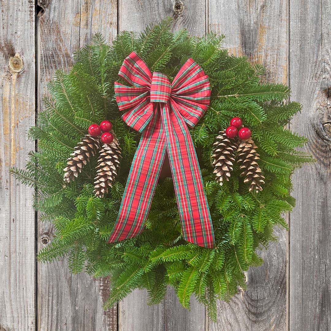 On a base of Balsam, this double-sided wreath is decorated with pine cones, red berries, and a red tartan bow. It measures 22".