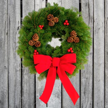 On a base of Balsam, this double-sided wreath is decorated with pine cones, red berries, and a bow. It measures 14".