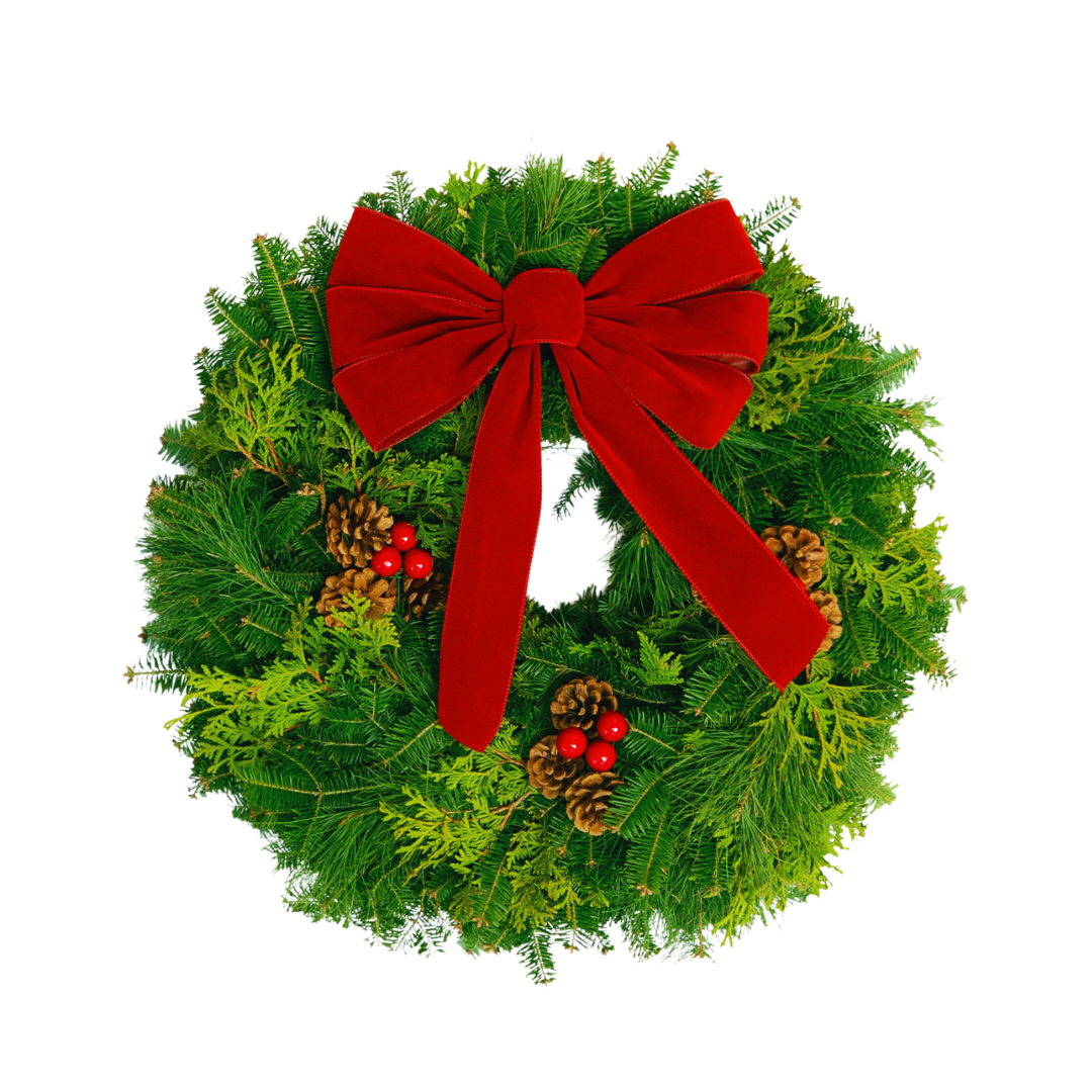 The Mount Cadillac Wreath is one of our largest and fullest wreaths! This seasonal favorite brings a lively style all of its own to any holiday display. On a base of Balsam, White Pine, and Northern White Cedar, the double sided Mount Cadillac measures at 28" of holiday beauty! Finishing touches include pine cones and a giant, hand-tied, red velvet bow. Double sided.