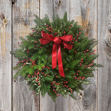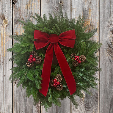This lavish centerpiece offers holiday beauty to any table. We create each centerpiece on a rich 16” base of Balsam, and Cedar. We add to its overall charm by adding decorative gold and white balls, two red candles, and white-tip pinecones. The result is a stunning statement for